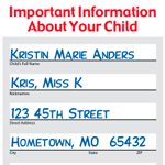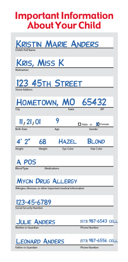 Record your child’s name, address, birth date, allergies, and any birthmarks or other identifying features that will help authorities identify your child.