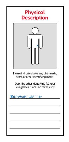 It is important to know exactly where any of your child's birthmarks, scars, or other identifying marks are on their person.